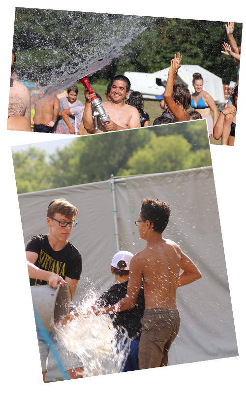 Im Sommer ist es bekanntlich heiß. Umso mehr freuen wir uns alle über eine nasse Abkühlung. Dafür gehen wir mit dem ganzen Zeltlager ins örtliche Freibad, duschen im kalten Wasser direkt aus dem Hydranten oder von der Feuerwehr oder unternehmen eine Kanutour. Am Platz darf natürlich eine Wasserschlacht mit Spritzpistolen und Wasserbomben nicht fehlen und manchmal gibt es auch eine Wasserrutsche.